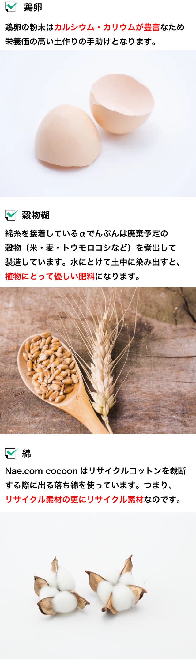 - 環境にやさしい!全てリサイクル&天然素材で人にも優しく、土に還るサスティナブル素材◎