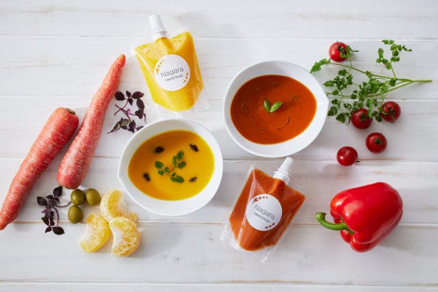 Nagara(ナガラ)は、ゼリー飲料等で使われる飲み口付容器に、こだわりの冷製スープを詰めたハンディスープです。