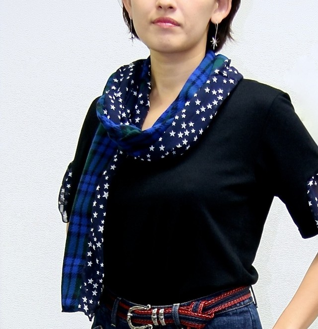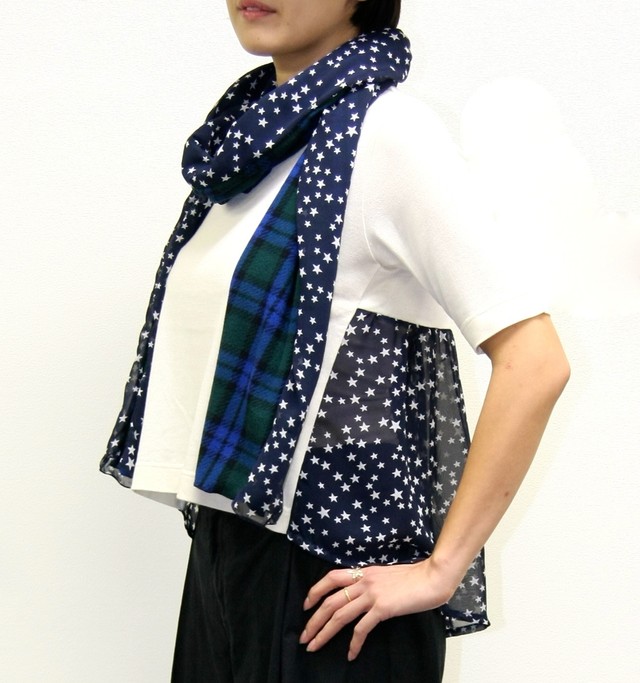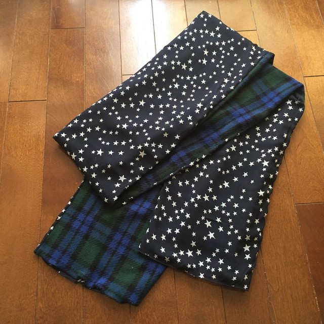 表側は流れ星が見られそうな夜空プリントの優しいジョーゼット素材で、首にあたる内側は優しいタータンチェックのフリースです。