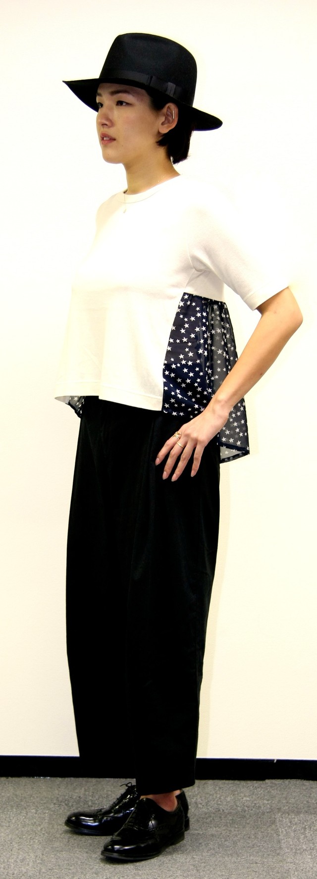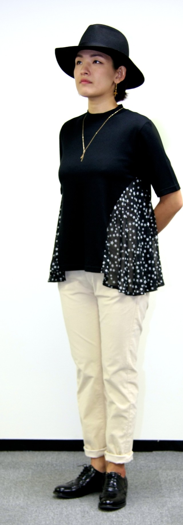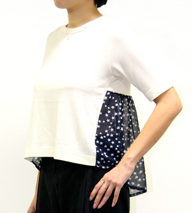 このTシャツは、身頃に肌触りの良いウール混のコットン素材を使い、流れ星が見られそうな夜空プリントの優しいジョーゼット素材を脇からバックスタイルにふんわりと配した切替デザインが特徴です。