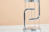 金属の重力、そしてボールチェーンの張力とのバランスにより、あたかも宙に浮いているように見せるのが「テンセグリティ」の特長です。