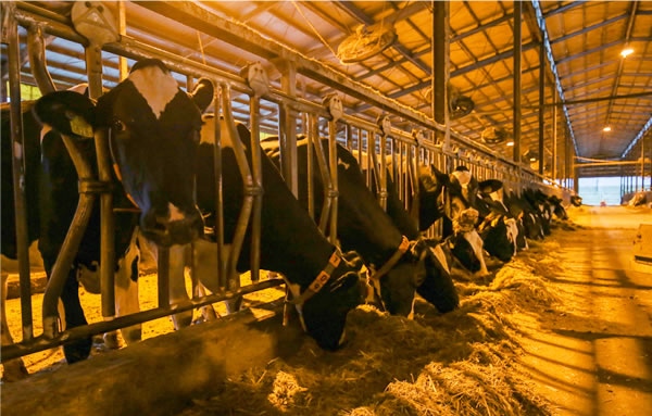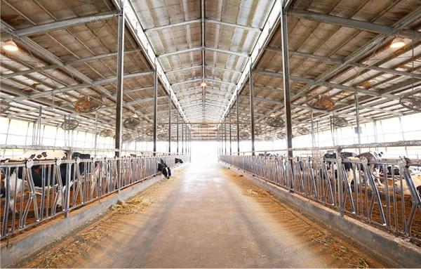 管理が行き届いた高い屋根の明るいフリーストール牛舎(牛を繋がずに自由に歩き回れるスペースを持った牛舎)で、のんびりとマイペースで牛さんは過ごしています。