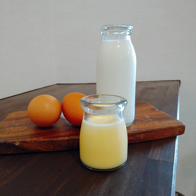 今回のプリンは、添加物や生クリームは入れず、生乳、卵、練乳、グラニュー糖の4種類の材料で作るシンプルなプリンです。