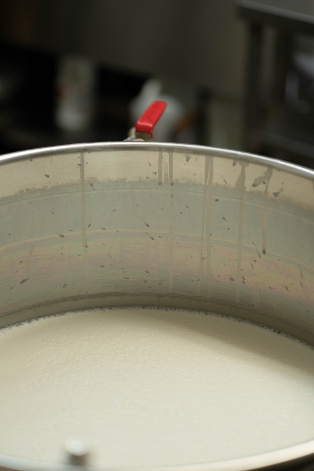 この絞ったばかりの生乳を工房に運び入れ、低温殺菌を行った生乳でチーズを作っています。