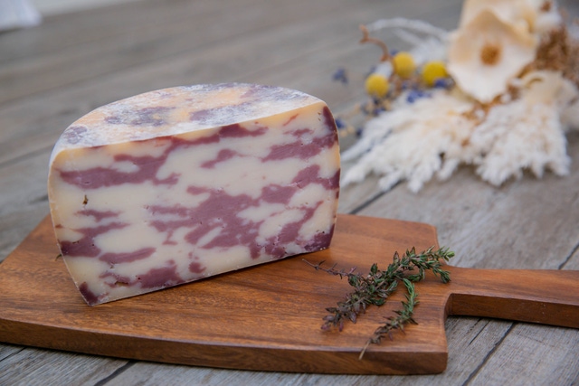 赤ワイン入りのワインゴーダ。ミルクの香りとチーズのコク。鼻から抜ける赤ワインの香り。色合いも綺麗なゴーダです。