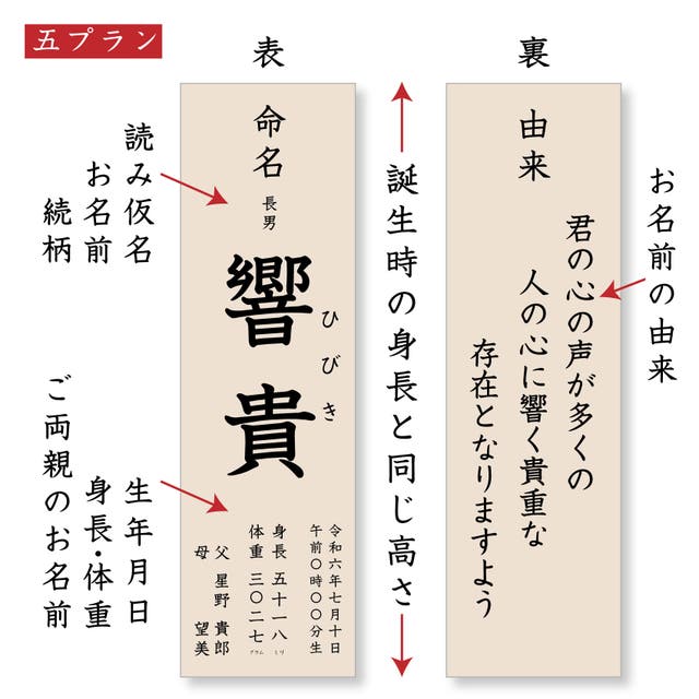 (表面に、お名前、読み仮名、続柄、生年月日、出生時刻、身長、体重、ご両親のお名前を刻印します)