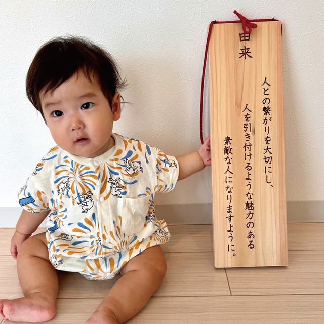 - 出生時と同サイズの木製命名書。宮大工による神社仏閣御用材の加工。神職による清祓い。
