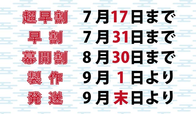 9月1日より順次制作を開始します。9月末日を目途にご注文の順番通りに順次発送させていただきます。