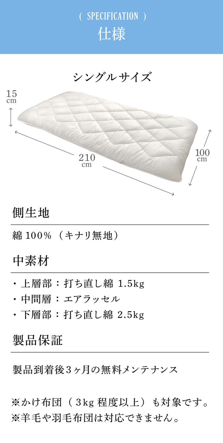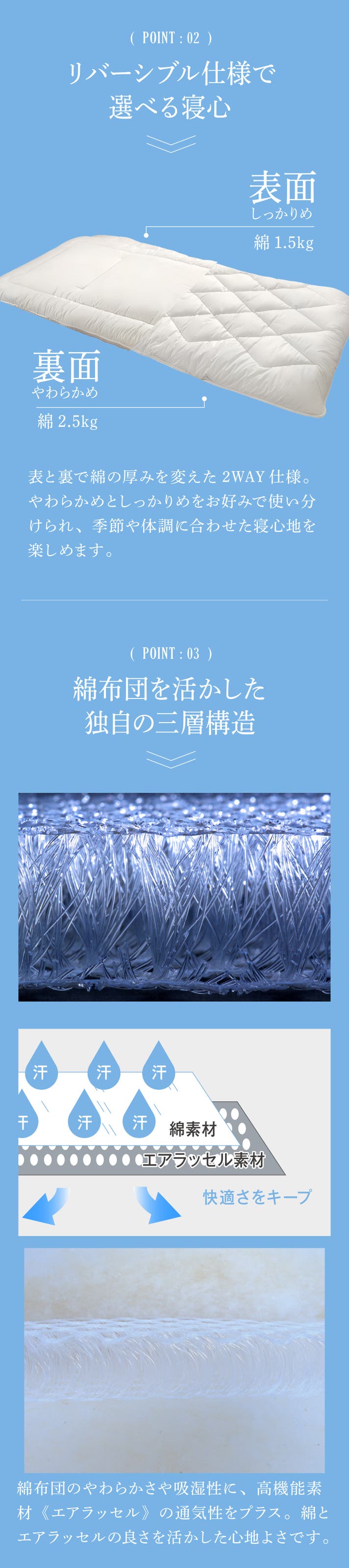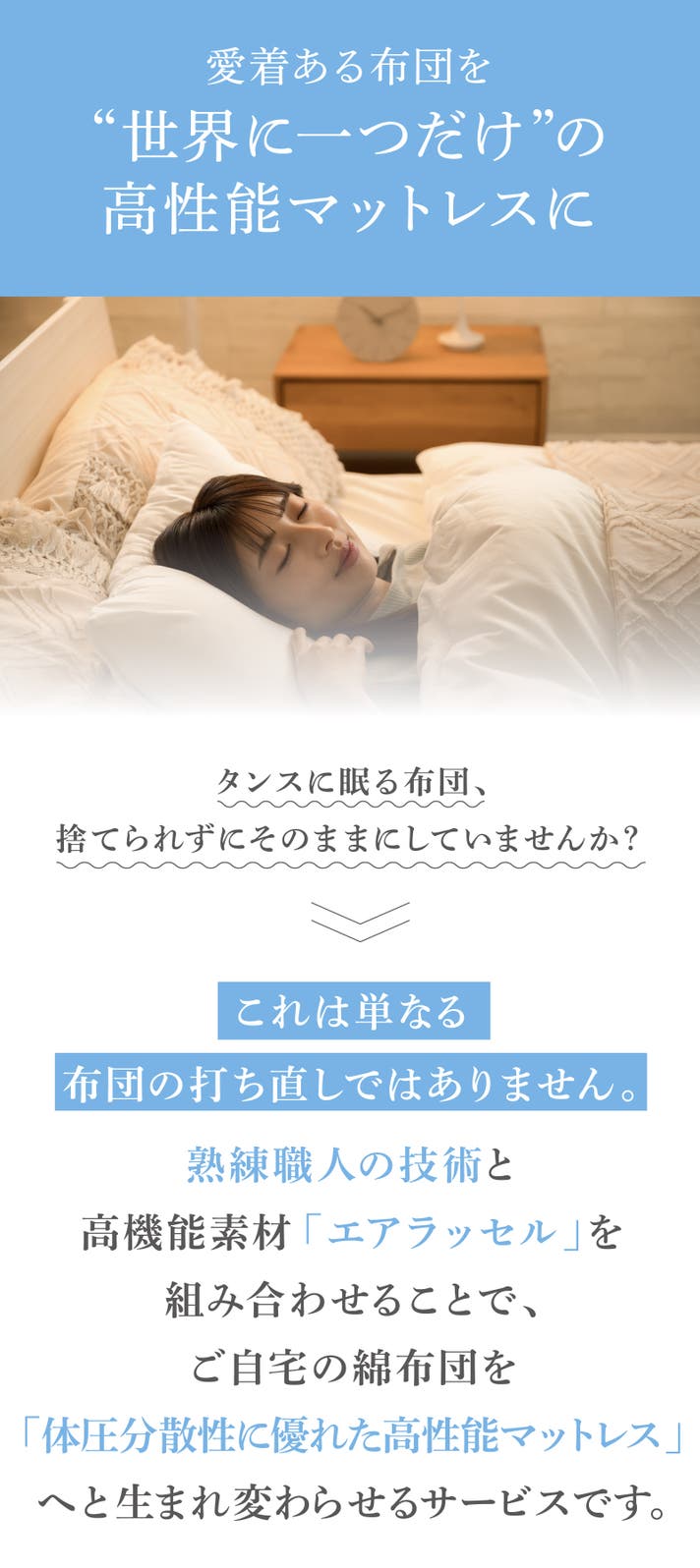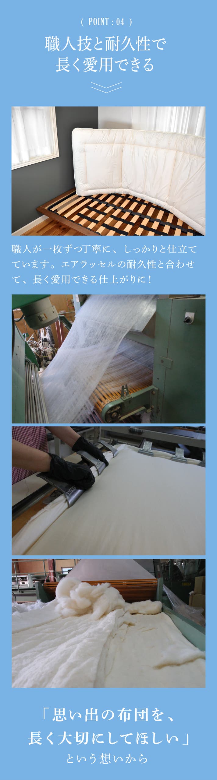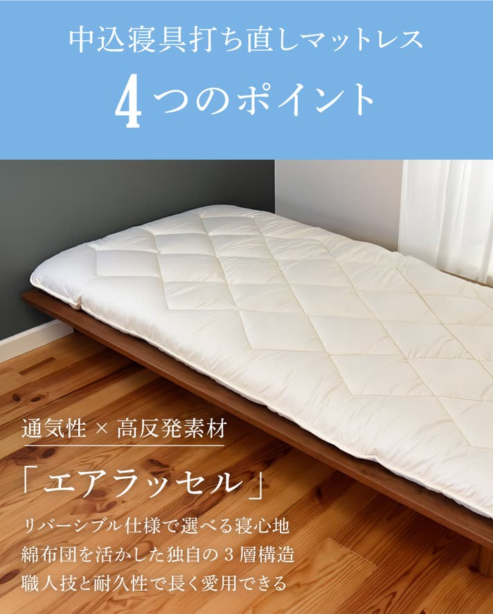 熟練の職人が布団ごとの状態や綿の質・量に合わせて調整することで、綿ならではの柔らかさと、高機能素材《エアラッセル》による寝心地を両立させました。