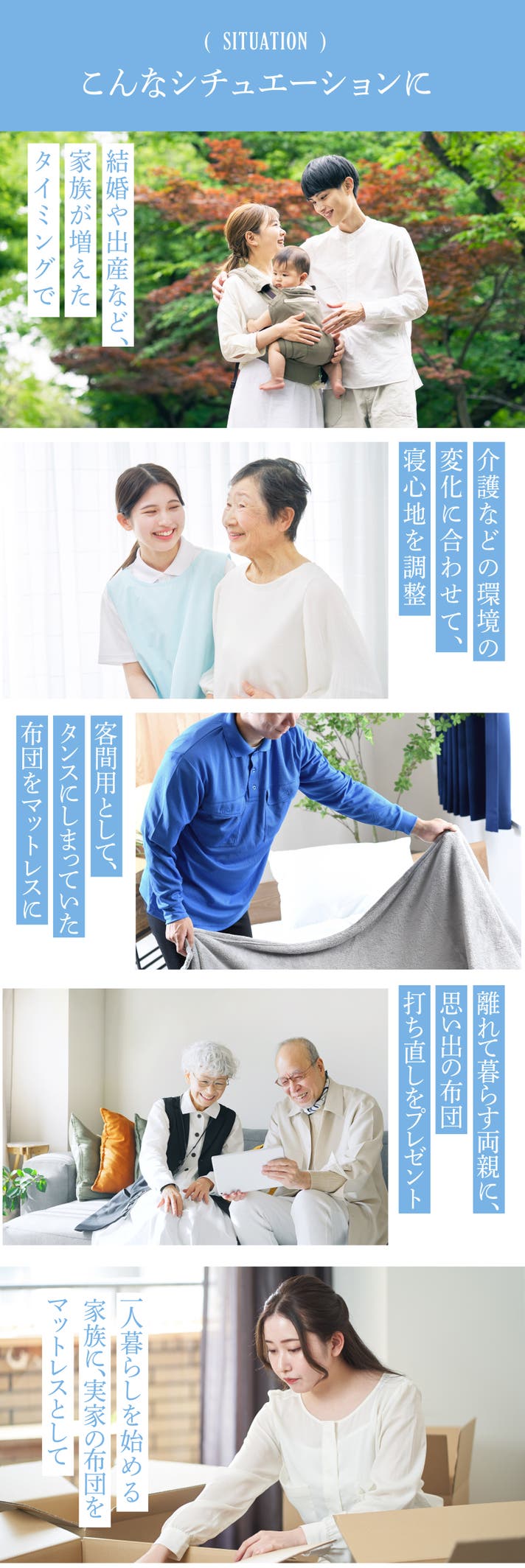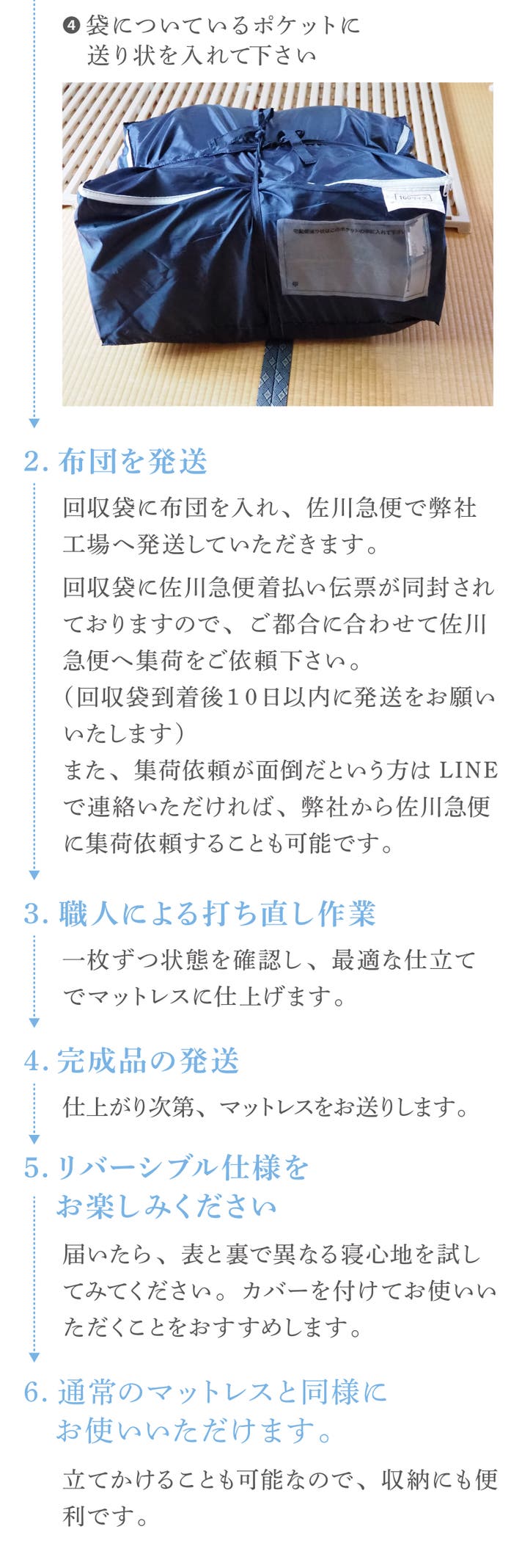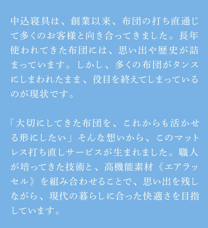 - タンスに眠る布団を打ち直し職人技と高機能素材を駆使して、快適な高性能マットレスに蘇らせます