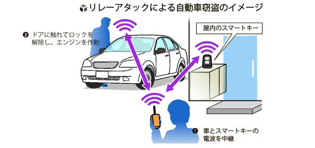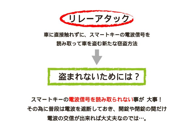 この車から離れたスマートキーの微弱な電波信号をスマートキーの近くで盗み取り、それを持ち主がいなくなった車の近くにいる仲間に送って中継すると、車にとってはスマートキーが近くにあるのと同じ状態になります。これにより車に物理的損害を与えることなくドアを開け、エンジンをかけて盗み去っていくことをリレーアタックと言います。