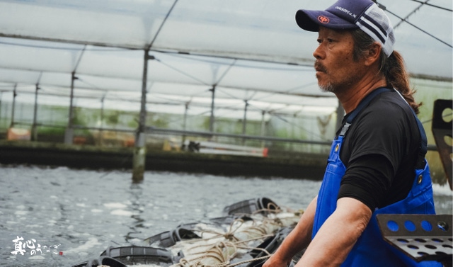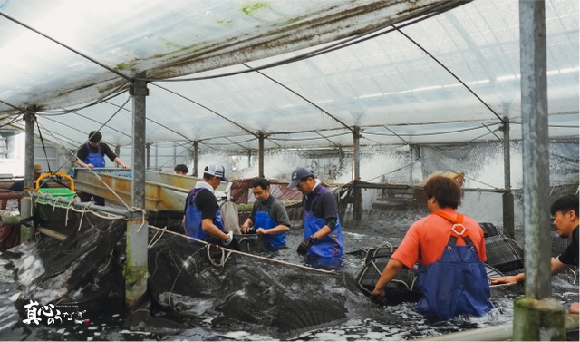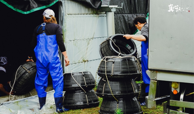 出荷の際は、養殖池からびく詰めし、中村商店のプールに移します。