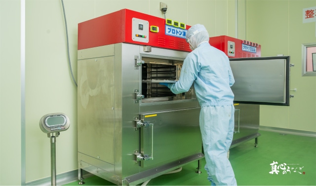 炊き立てそのままと変わらない食感を出すため、プロトン凍結機で急速凍結しました。プロトン凍結機で凍結したものは、細胞を壊さず凍結するので、解凍した後もできたての美味しさを保てます。ご飯が白蝋化(はくろうか:蠟のようにぱさぱさした状態)しないのも特徴です。