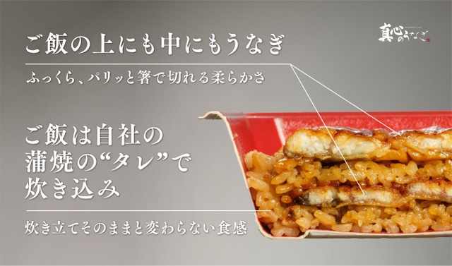 お米は、宮崎県えびの産のヒノヒカリを使用。弊社で使用しているタレで炊きこんでいます。どこから食べてもうなぎが味わえるよう、ご飯とご飯の間に蒲焼を挟んでいるので、ご飯の味が濃くならないように調整して炊いています。