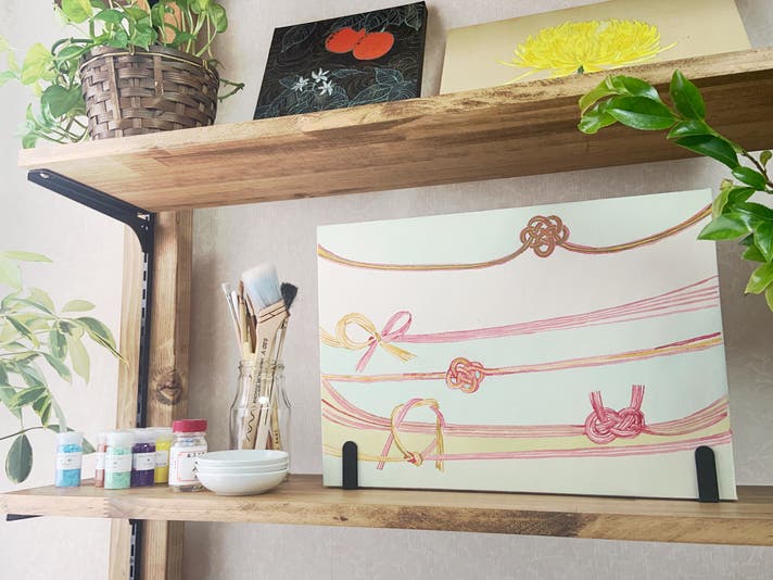 グラフィックデザイナー・イラストレーターとして20年以上活動してきた経歴を、新たに学んだ日本画に取り入れて、一筆、一線に、縁をつなぐ思いを込めました。白い和紙に心を清くし筆を水に委ねる。地元長野県の名産であり縁起物でもある水引をモチーフにして描いています。