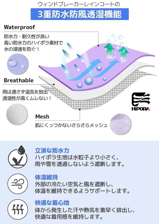 ハイポラ生地は、世界有数の先端化学メーカーKOLON(コーロン)社が開発した生地で防水、防風、透湿に3つの優れた機能を持っています。