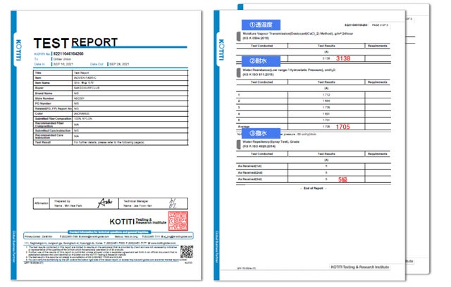 ウィンドブレーカーレインコートは、透湿、耐水、撥水の3つのテストで性能が認められ、撥水機能は最高等級の5等級を受けました。