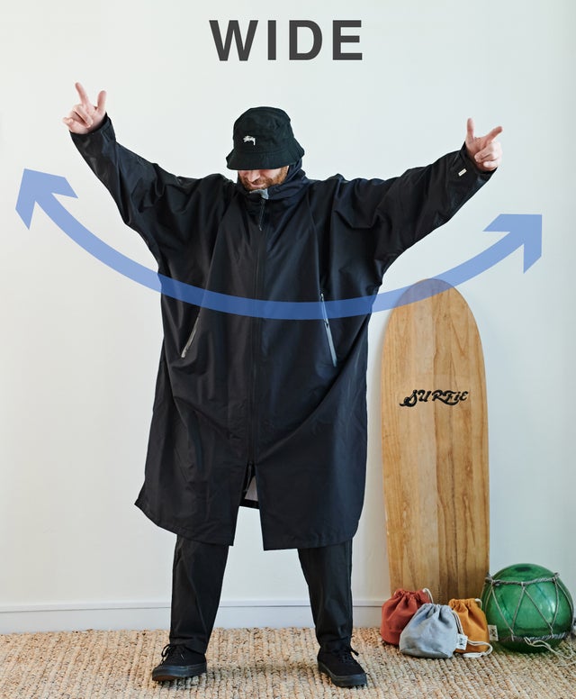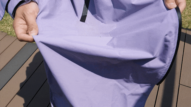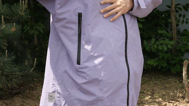 広い袖は風通しがよくレインコート内部を素早く乾燥させ、強風が吹いたり暴雨がふった時は袖手首のベルクロを止めて袖の中に入ってくる雨風を防ぎ体温を維持することができます。