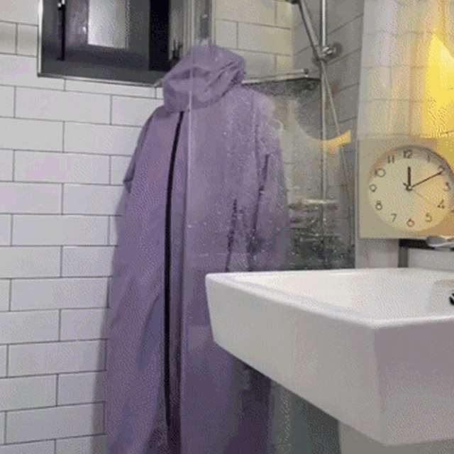 そしてシャワーをかけて30分間放置し、レインコートを脱がしてTシャツの状態を確認しました。全く濡れていないことが確認されました。