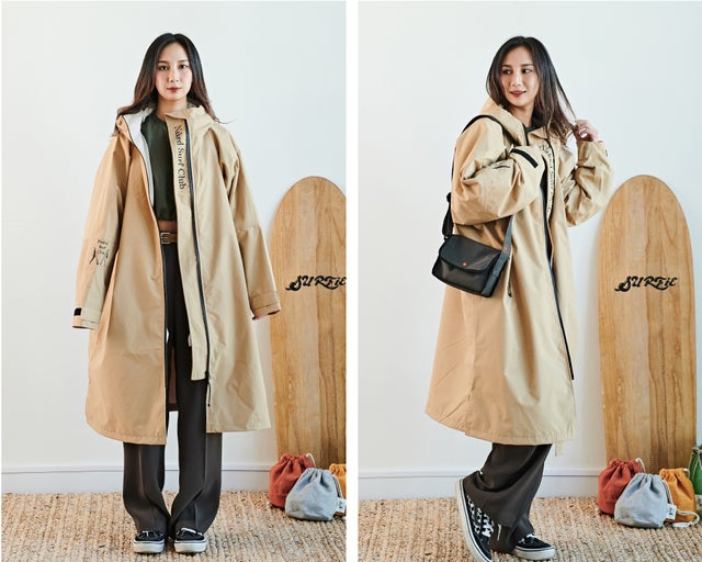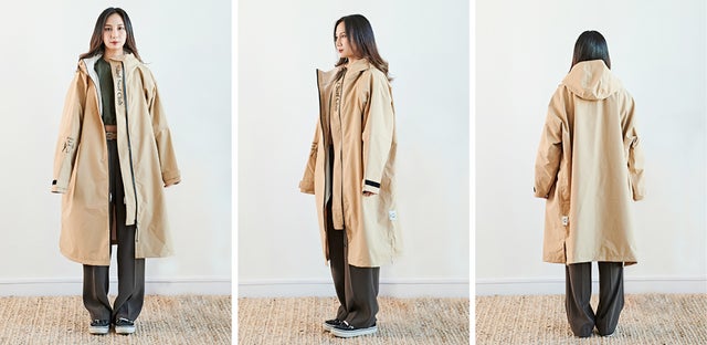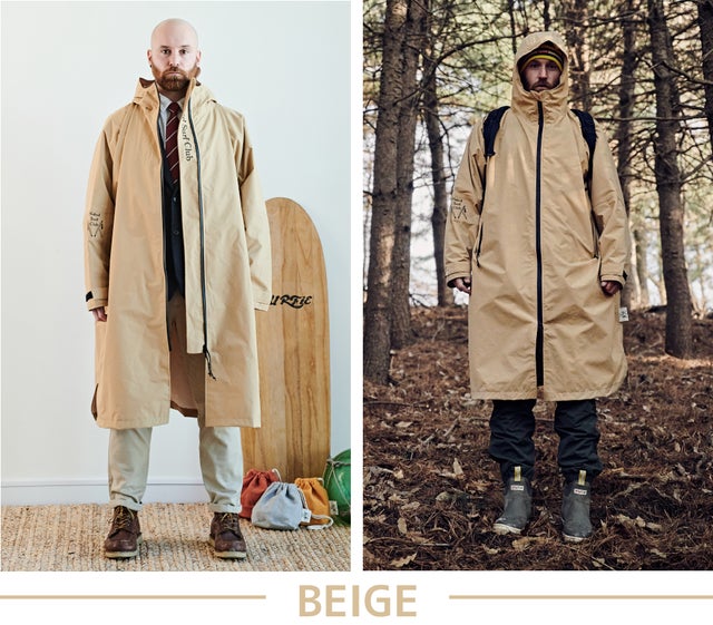 カジュアルなベージュカラーはスーツに合わせてビジネスカジュアルに演出できます。山や海、アウトドアの時には機能性レインコートに変身。