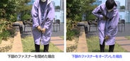 ウインドブレーカーレーンコートは、足の動きを妨げないようにダブルファスナーで構成されています。上部ファスナーはしっかり閉めて、下部ファスナーは開けて自転車に乗ってみてください。快適なライディングができます!