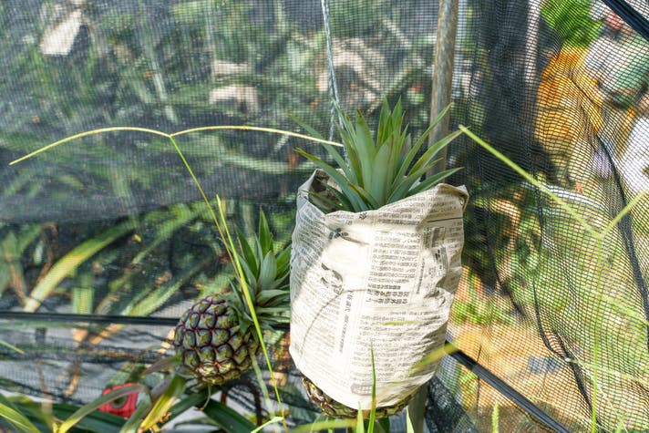 日の光を満遍なく充てる為にパインの向きを1つ1つ調整し、とても大きな実をつけるので倒れないように紐で吊りあげ1つ1つ固定します。