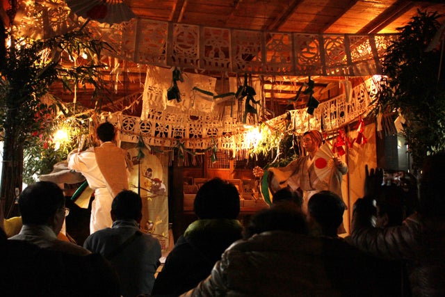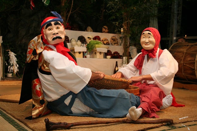 高千穂町の冬の風物詩「夜神楽」でも、夫婦神である伊弉諾(イザナギ)・伊弉冉(イザナミ)がどぶろくを醸す様子を模した“御神体”という舞が舞われています。ザルと桶を持ってどぶろくを醸し、酔っぱらうというユーモラスな舞です。