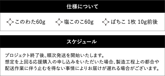 ※内容量:このわた60g、塩このこ60g、ばちこ(10g前後)1枚 ×2セット