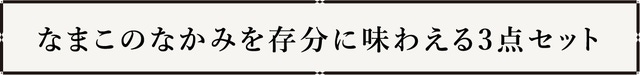 大量生産ができないため、飲食店や百貨店でもなかなか出会えないなまこの珍味。私たちは、なまこ独特の芳醇な磯の香りを、もっと多くの方に味わっていただきたいと思っています。ご家庭でも気軽に楽しんでいただけるよう、3種のセットをご用意しました。