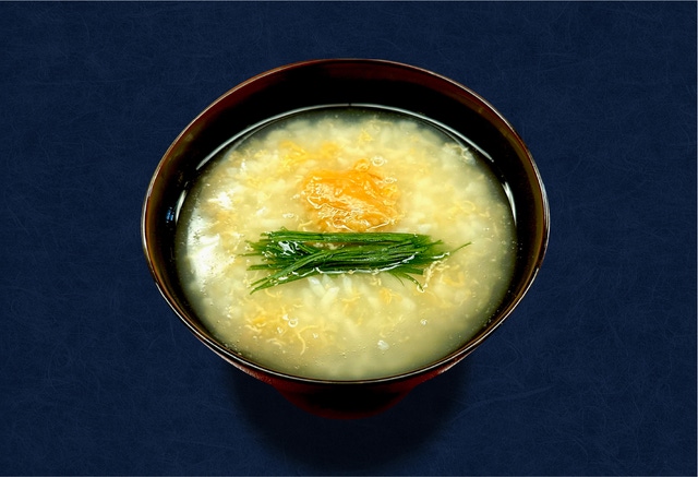 雑炊の楽しみ方:昆布だしに少量の日本酒を加えて味を調え、ご飯を入れて少し煮立てます。最後に「塩このこ」を入れると、ふわっと花が咲くようにこのこが開きます。