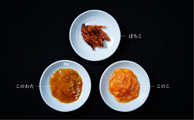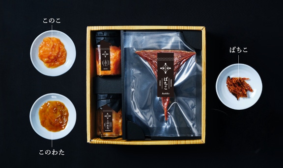 なまこの腸の塩辛「このわた」を、このわたより更に希少ななまこの卵巣の塩漬け「塩このこ」、卵巣を乾燥させた「ばちこ」と一緒にお届けします。