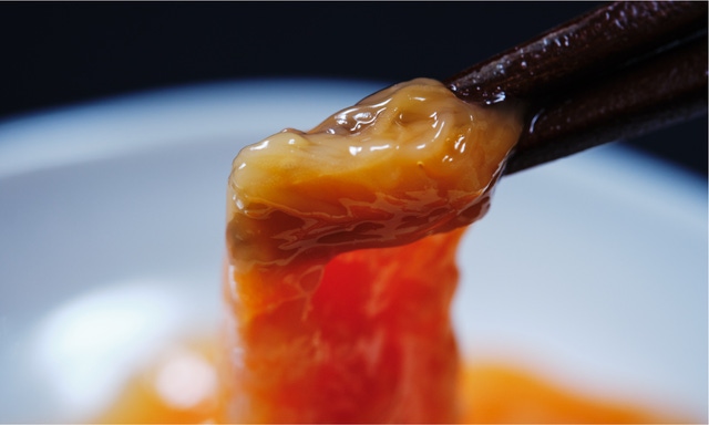 弊社の「塩このこ」は、なまこの精巣を加えているため、オレンジと白のマーブルのような色をしています。魚の白子のようにクリーミーで、塩辛さの中にほんのり甘みが感じられます。