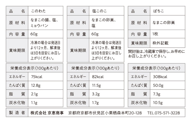 ※内容量:このわた60g、塩このこ60g、ばちこ(10g前後)1枚