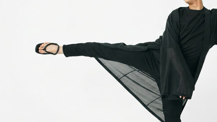 新構造レザー雪駄「USHIWAKA-牛若-」を履いた足元は、