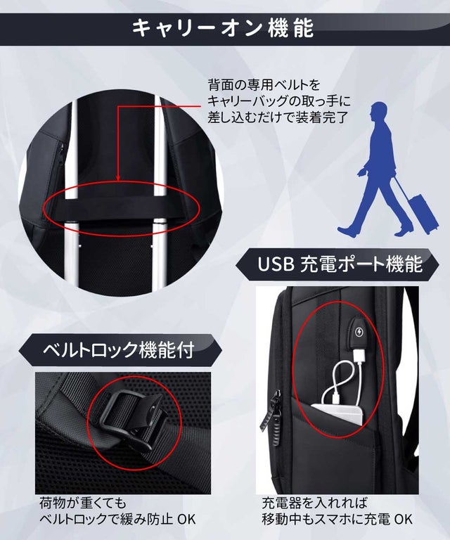 出張に便利なキャリーオン機能&USBポート機能 リュック編