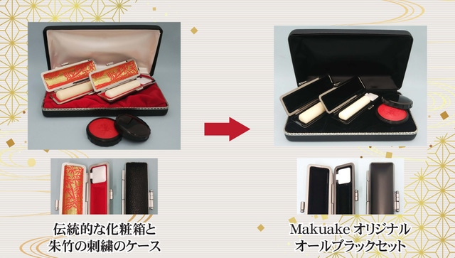 通常の化粧箱は朱肉を入れるスペースは無いのですが、今回、特別に1本用・2本セットともに朱肉が入る化粧箱をご用意いたしました。本革製で高級感があり、様々な場面で使いやすいように外側も内側も黒で統一しております。