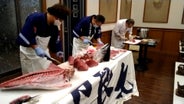 観光ホテルでの弊社スタッフによるマグロの解体ショーの場面です。