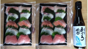 (1)おさかな丼2人前(140g×2)・藤野マグロ醤(150㎖)セット¥4,500 50セット(10%オフ)(税込送料込)