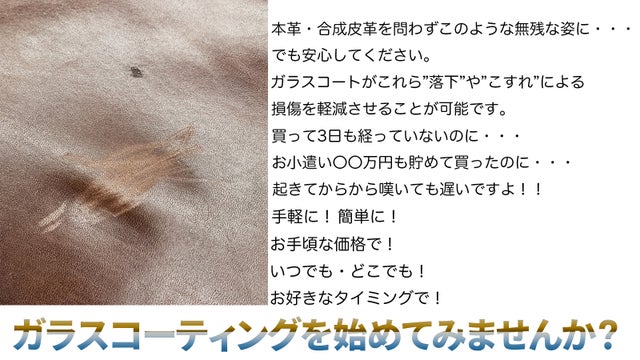 *ヌメ革・スウエード・その他 鞣めしていない革のご使用はガラスコーティングが色濃く出る恐れがありますので、ご使用者の判断にてお願い申し上げます。