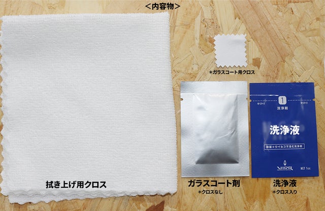 洗浄液1枚・コーティング剤1枚・ミニクロス1枚・クロス1枚