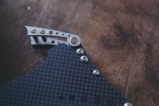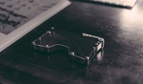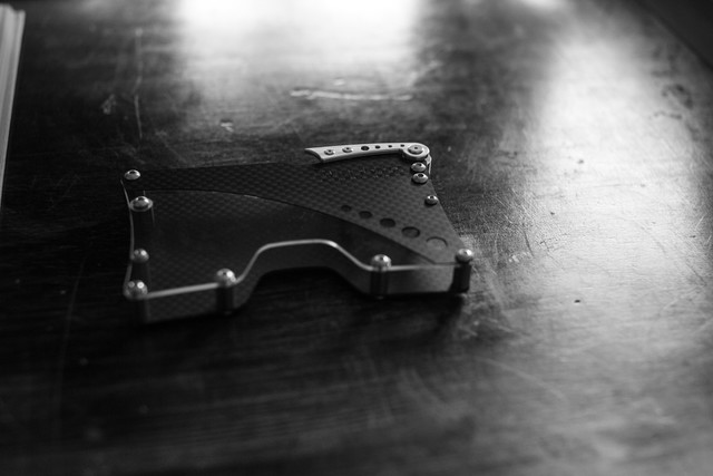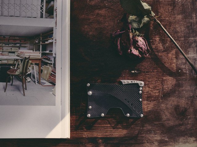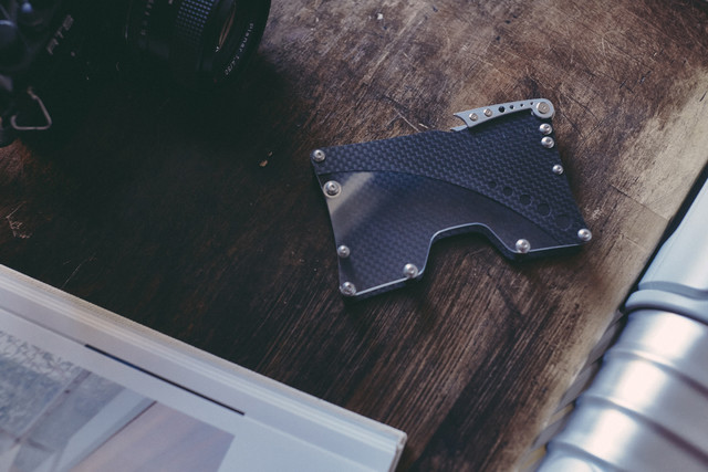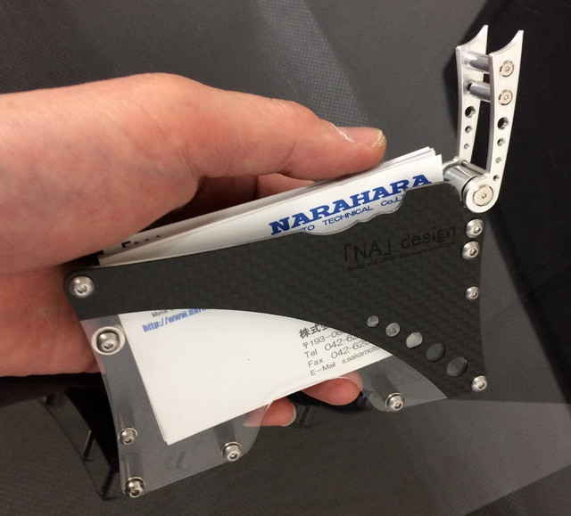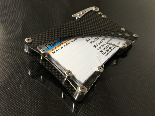 使用する部品は、F1や航空機にも用いられる鉄の10倍の強度で重さ1/4の高価なCFRP(炭素繊維強化プラスチック/通称カーボン)を一枚づつウォータージェット(※1)で加工し表裏2面に使用しています。また、ストッパー部分は一つづつマシニングセンター(※2)でアルミブロックから切削加工、透明部分は表面ハードコートアクリルを使用するなど、他の名刺入れではほとんど見かけない高価な構造部品を使用し、とても軽く(57g/ハンカチ3枚程度)、しかし堅牢で剛性のある構造に仕上げます。