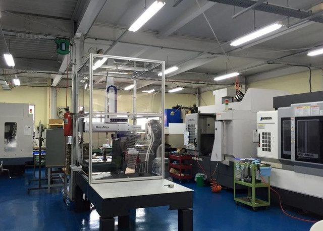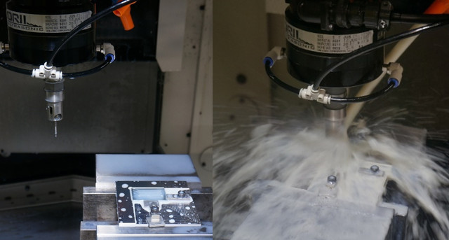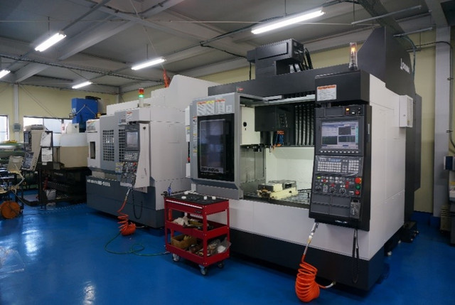 3D CADで設計モデリングしたデータを基に、アルミ部品はCAMデータを作成し、社内のマシニングセンター(前述※2注記、下写真参照)で切削加工します。使用するマシニングセンターは、超高性能スピンドルを使用した微細加工(Φ0.05mm~)から600×1000mmの大プレート加工まで対応可能。