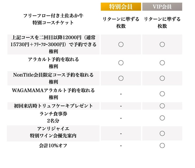 今回は、この土佐あか牛を使った特別なコースと、NARITAYUTAKAを存分に楽しんでいただくため、特別会員権とVIP会員権をご用意させていただきました。