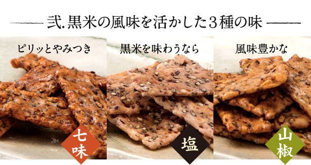 黒米「武士米」の独特の風味をそのまま味わっていただける塩味、オリジナリティ溢れる七味味、新感覚の山椒味の、3種の味わいをお楽しみいただけます。