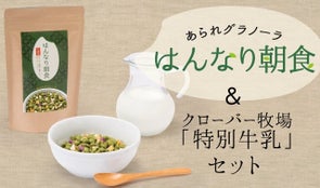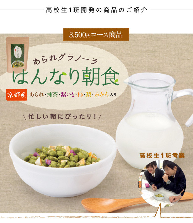 【Makuake限定先行販売】産学連携で高校生が考案した“新しいあられ”の食べ方!グラノーラ風の京都宇治抹茶あられ「はんなり朝食」と、地元クローバー牧場の「特別牛乳」のセットです。
