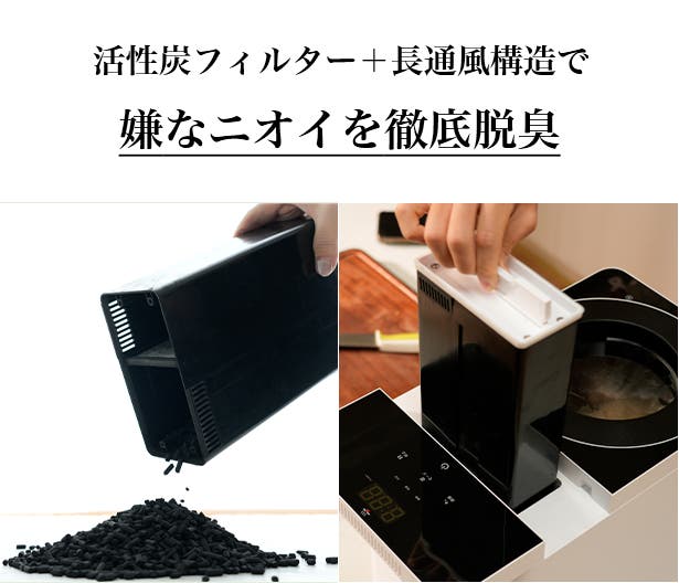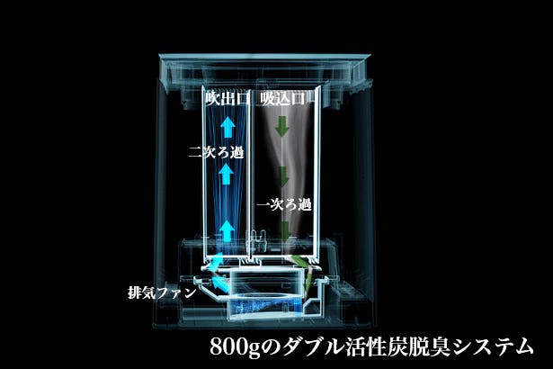 800gのダブル活性炭脱臭システム+独自の通風構造で、生ゴミの嫌なニオイを逃さず効率的に吸着できます。