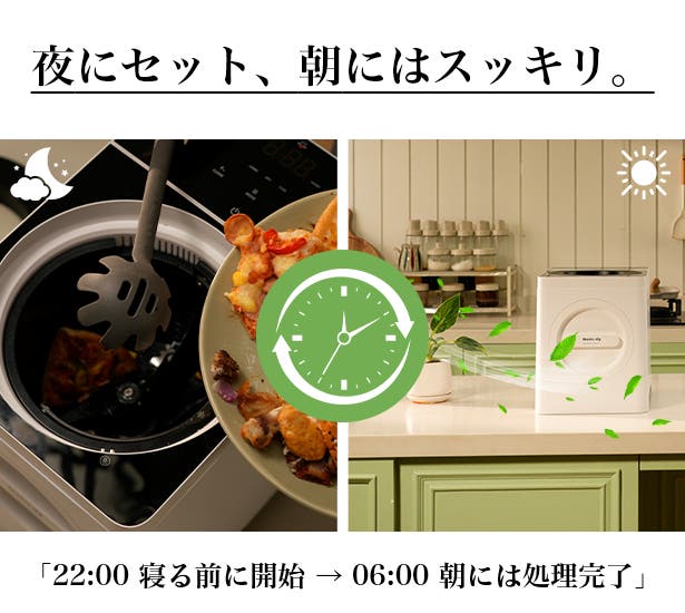 忙しい毎日でも、生ゴミ処理はこれ1台で完結。就寝前にポイッと入れるだけで、朝には乾燥・粉砕まで完了。高効率ヒーターと回転ブレードでしっかり処理し、虫の心配もない。さらに、低騒音設計だから夜間でも気にならず、深夜でもご近所への迷惑を気にすることなく安心してお使い頂けます。