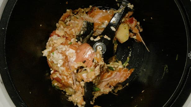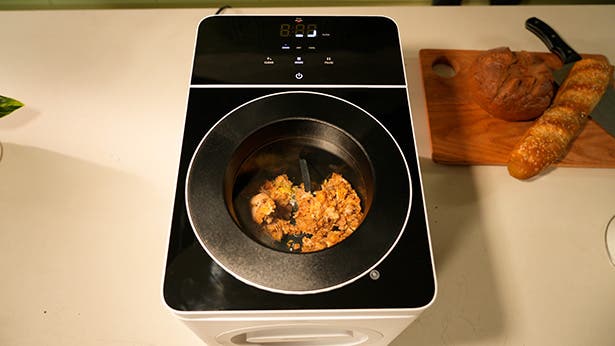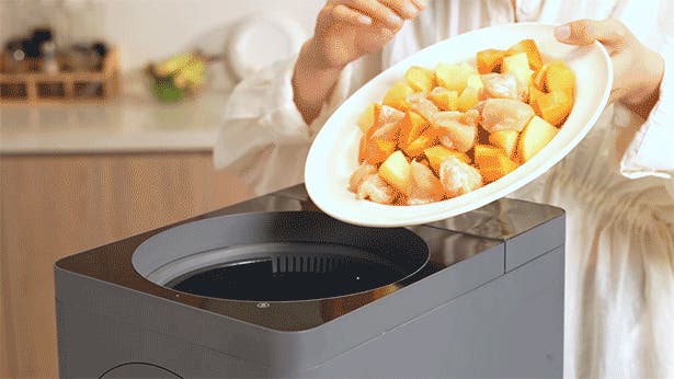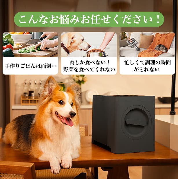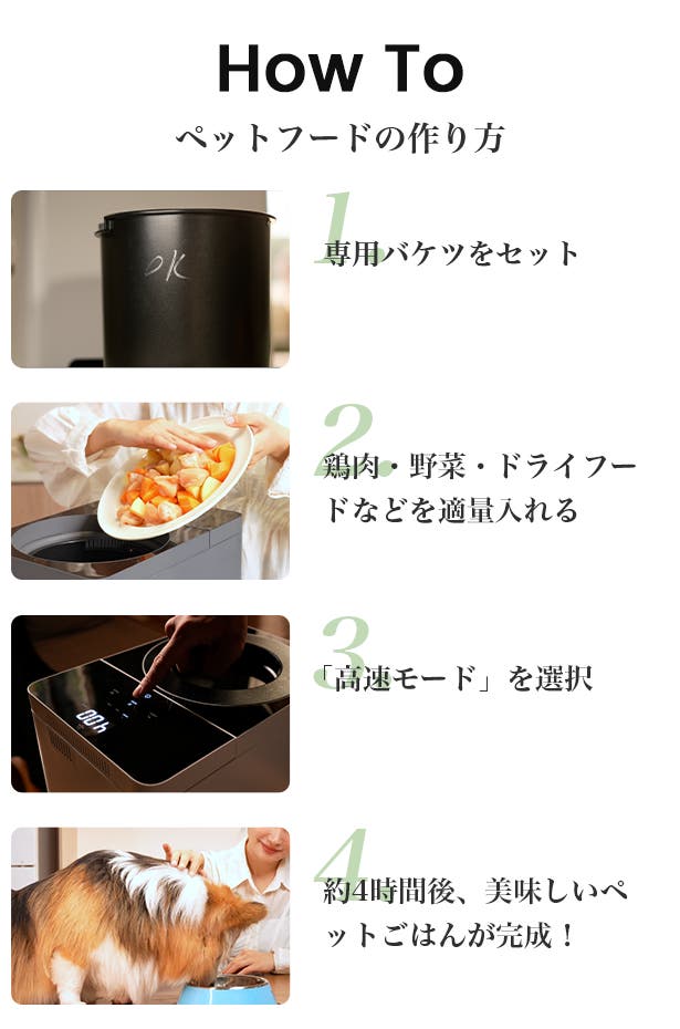 「鶏むね肉」「ブロッコリー」「ペットフード」など、愛犬・愛猫の好みに合わせた食材を一緒に入れるだけ。加熱・乾燥・攪拌を自動で行い、約4時間後には栄養のペットフードが完成します。