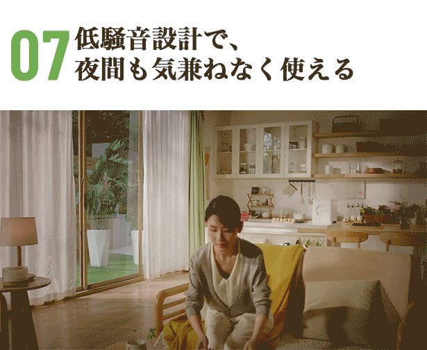 高効率モーターと吸音設計で、深夜や早朝でも音が気にならない。「生活音」レベルに抑えた動作音だから、賃貸や集合住宅でも安心して使えます。