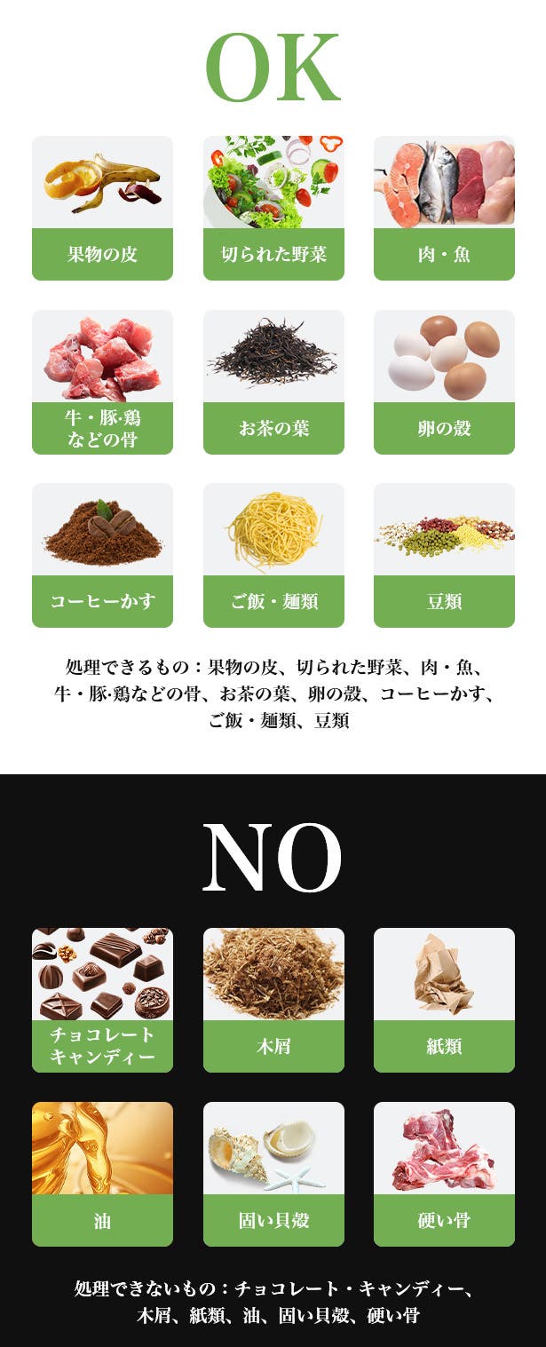 A3. 硬すぎる骨(大型の牛・豚の骨)、貝殻、石、ガラス、金属などは処理できません。家庭用の一般的な生ゴミは対応可能です。